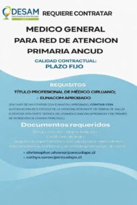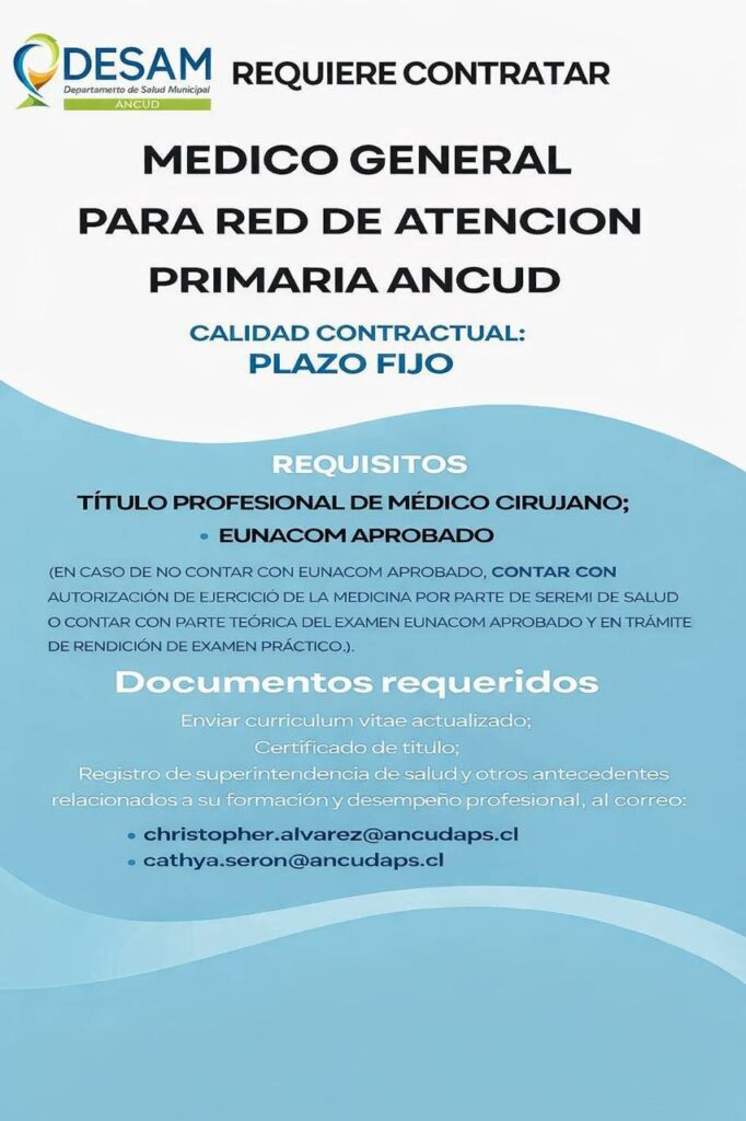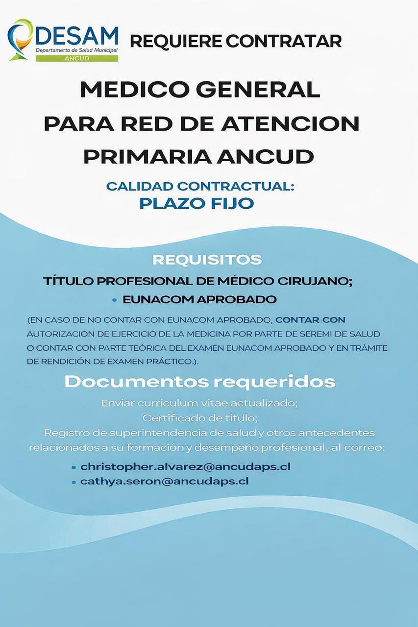 DESAM REQUIERE CONTRATAR: MEDICO GENERAL PARA RED DE ATENCION PRIMARIA ANCUD