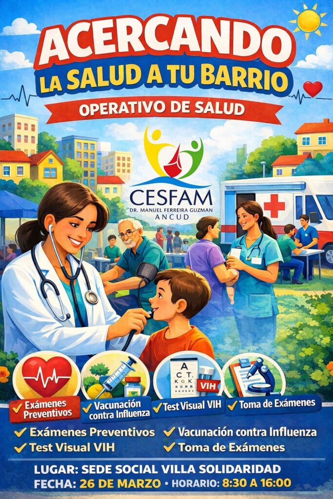 El operativo de Salud “Acercando la salud a tu barrio” se realizará el día jueves 26 de marzo, en horario de 08:30 a 16:00 horas, en la sede social de Villa Solidaridad.