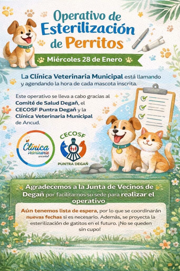 Informamos a nuestra comunidad que el miércoles 28 de enero se realizará el operativo de esterilización canina en la localidad de Degañ.
