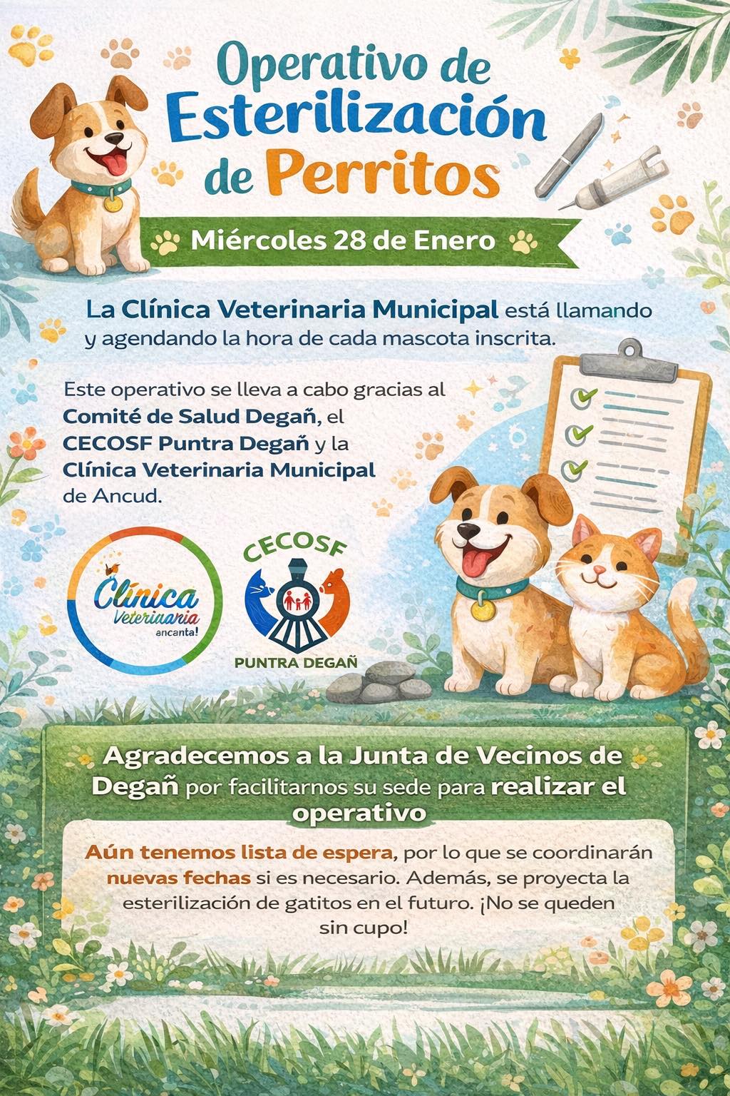Informamos a nuestra comunidad que el miércoles 28 de enero se realizará el operativo de esterilización canina en la localidad de Degañ.